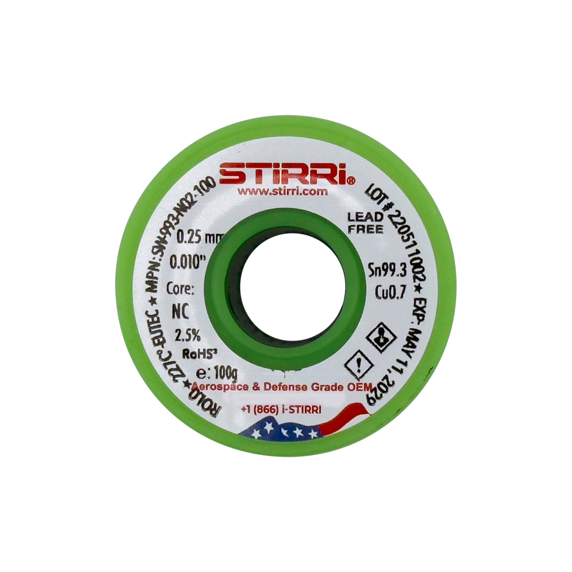 STIRRI-LF-993 Sn99.3Cu0.7 - 0.15 mm 0.005" no-clean lead-free eutectic solder wire 2.5%-3.3% NC-core - 100g spool (ROL0) - for soldering electronics, sensitive devices
